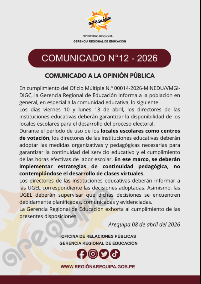 En esa línea, de acuerdo con el comunicado N.° 12-2026 de la Gerencia Regional de Educación de Arequipa, los directores deberán adoptar medidas para la recepción del material electoral de la ONPE y la organización interna de sus instituciones.